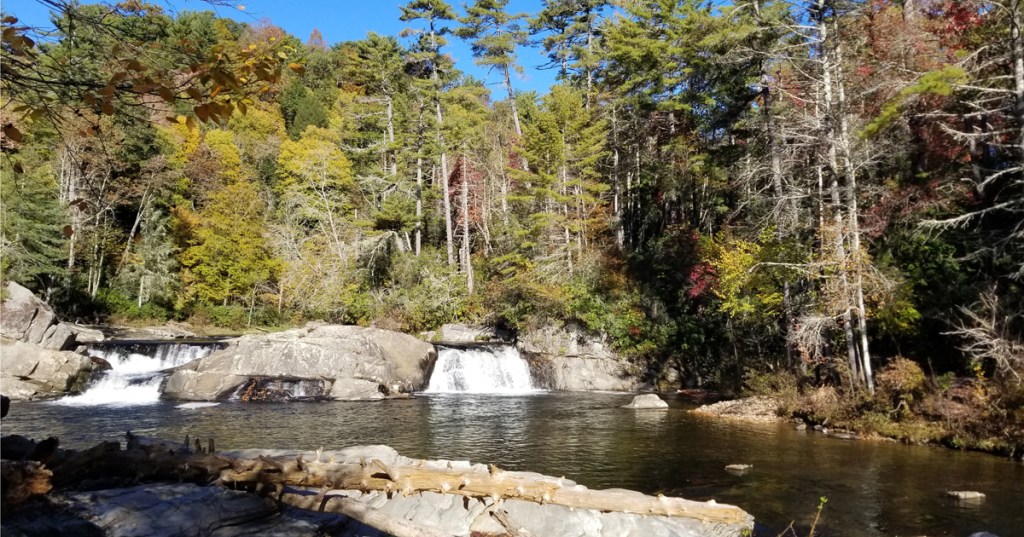 As it became apparent that the warm days were going to continue throughout the week, I decided to head back to the Blue Ridge Parkway, but this time further north. The mornings were in the high 40s, so I took the truck instead of the bike for the trek to Linville Falls, a three-tiered waterfall that plunges into the Linville Gorge. From the Visitors Center near Mile Marker 316, it was a fairly easy half-mile hike to Upper Falls, and just a little bit further to an overlook where you get a full panorama of the waterfalls and the valley below. This was certainly one of the times I was happy to be a morning person – as I made my way back down the trail to the Visitors Center, crowds of hikers were headed up.