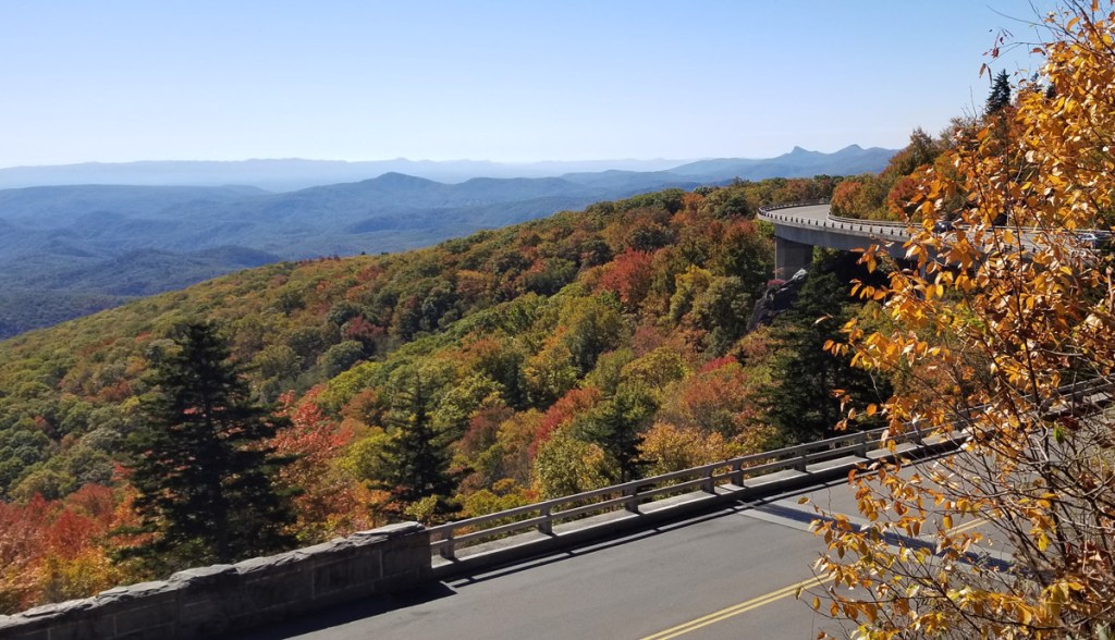 Once back on the road, I took the Park Ranger’s advice and travelled north on the Parkway to hike the trail that starts from the southern terminus of the Lin Cove Viaduct. With 153 segments weighing 50 tons each and spanning 1243 feet, this Viaduct is an engineering marvel. As the Parkway neared completion in 1983, the last segment needed to connect the sections through Grandfather Mountain in an environmentally responsible way. Instead of cutting into the side of the mountain, this section was accomplished by elevating the road and creating a complicated “S” curve concrete bridge that snakes around the boulders of Linn Cove. The resulting glimpses of the concrete viaduct through the dense forest of the mountain is a stunning combination of man-made and natural beauty. I also stopped at the northern terminus of the viaduct and walked the path that runs parallel to the road for a different view of the viaduct and valley. Incredible!!