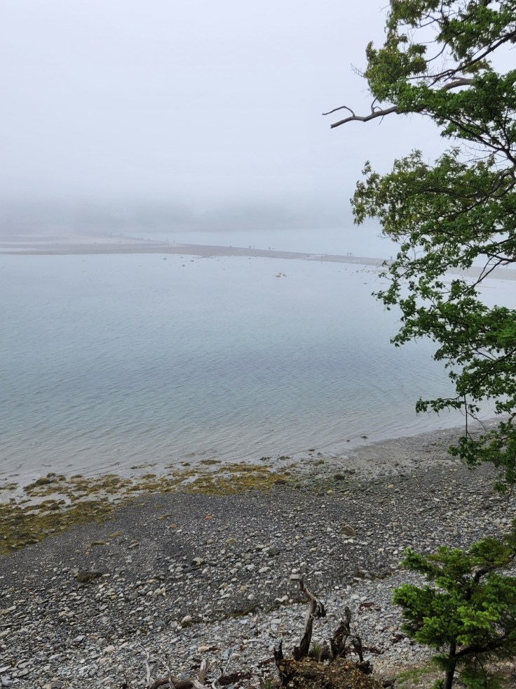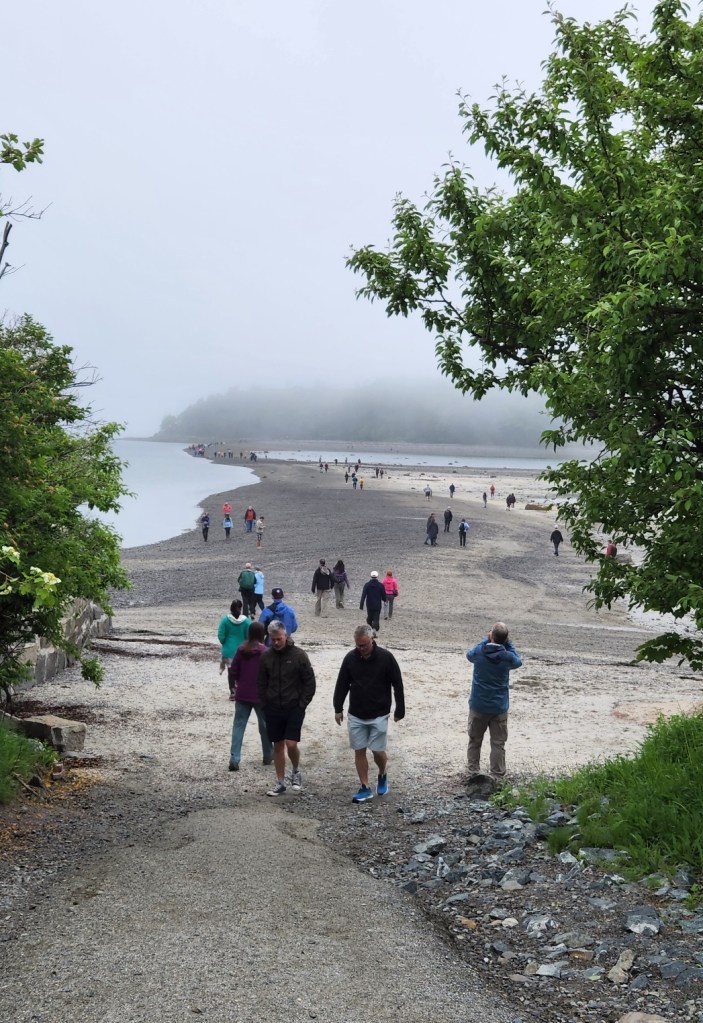 I gazed out the window of the La Rochelle Mansion and Museum onto the misty, foggy morning and spied a small crowd gathering at what appeared to be the halfway point between the “mainland” and an island, on an abrupt ending of rocks into water. Oh, that must be Bar Bridge! I surmised by the distance of water between the crowd and the island that I didn’t need to rush my museum tour in order to partake in the crossing and a short hike around Bar Island. So, I continued exploring the 1903 Bowdain chateau that provided 13,000 sq ft of opulent living space for the descendants of Alexander Hamilton on a choice 2 acres of waterfront land overlooking the harbor.