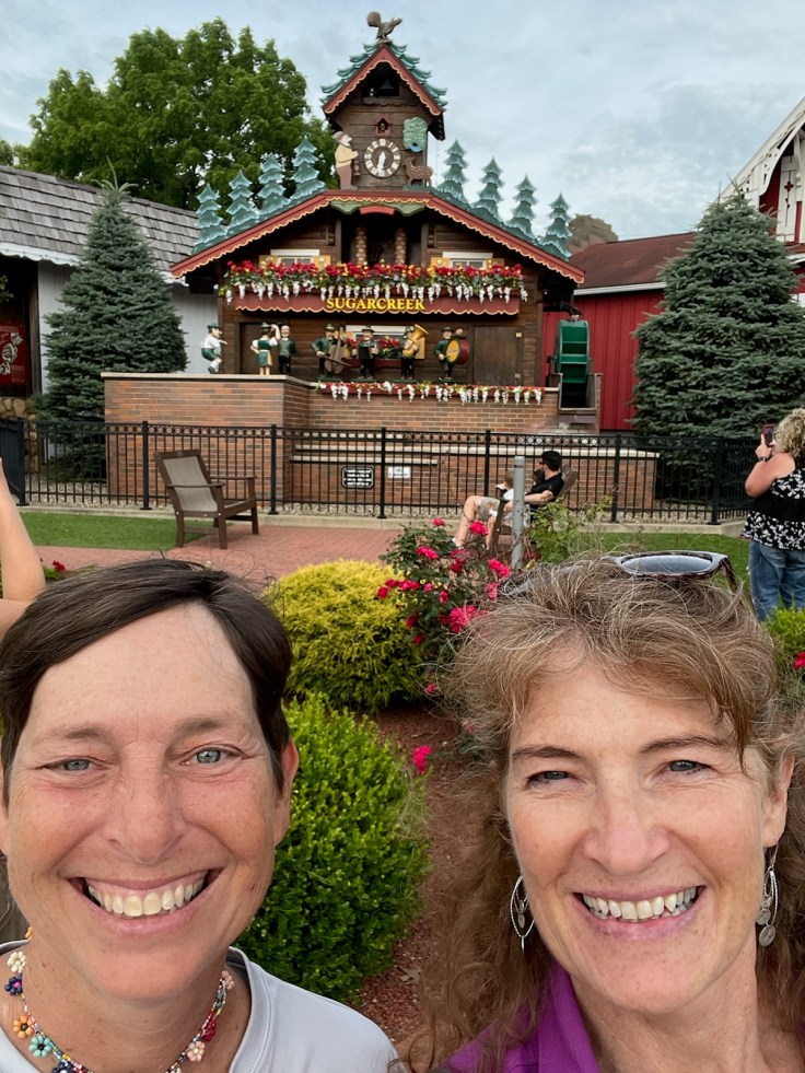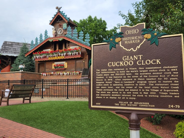 Of course, no visit to the area known as the Little Switzerland of Ohio would be complete without a visit to the Giant Cuckoo clock in Sugar Creek! It was featured on the cover of the Guiness Book of World Records in 1978 as the worldβs largest cuckoo clock. We showed up on the half hour and watched as the wooden band emerged to play a polka for the dancer figurines to twirl around to. The kids that had gathered got the biggest kick out of it (and so did I!)