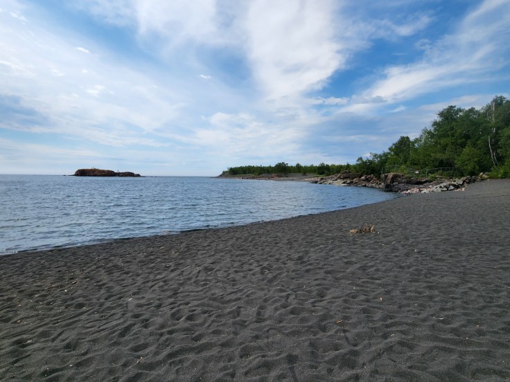 A little further south on MN-61 in Silver Bay is Black Beach. The beach appears black because tiny pieces of taconite (a low grade iron ore mined locally), washed ashore from mining operations, have mixed with the sand.