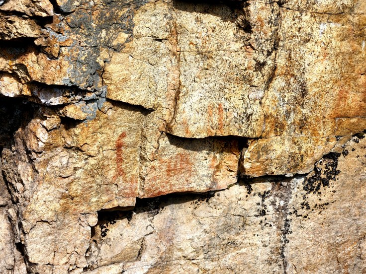 Close-up of the ancient pictographs. I enhanced the contrast in the photo to make the pictographs darker for easier viewing.