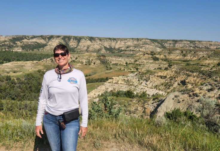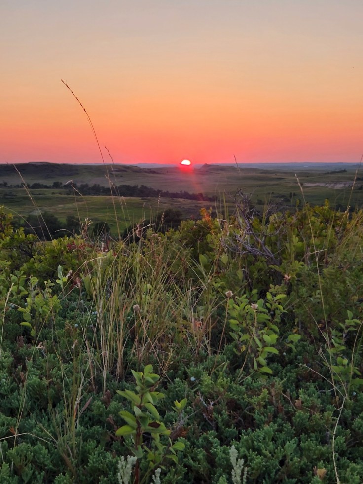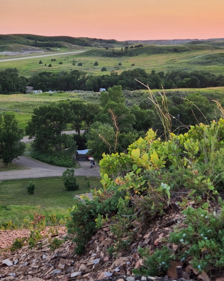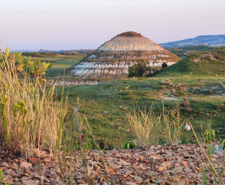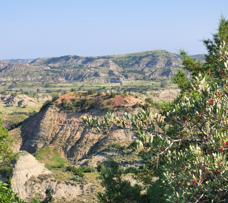 After rolling past miles and miles of green and golden North Dakota farmland since leaving Minnesota’s lake country, the landscape started to lose its orderly patterns and give way to something a little less agriculture. A little more wild. The whine of the engine straining to pull the camper alerted me to the changing elevation as the ribbon of asphalt passed beneath my tires. I was within striking distance of my campground, so I hadn’t planned on stopping in Theodore Roosevelt National Park yet, even though it was on the way where I would be setting up camp for the next few days. I was saving the Park for the next day. I spied the sign stating that I had entered the park boundary, but I still was not prepared for the stunning scenery that opened before me around the next sloping curve.