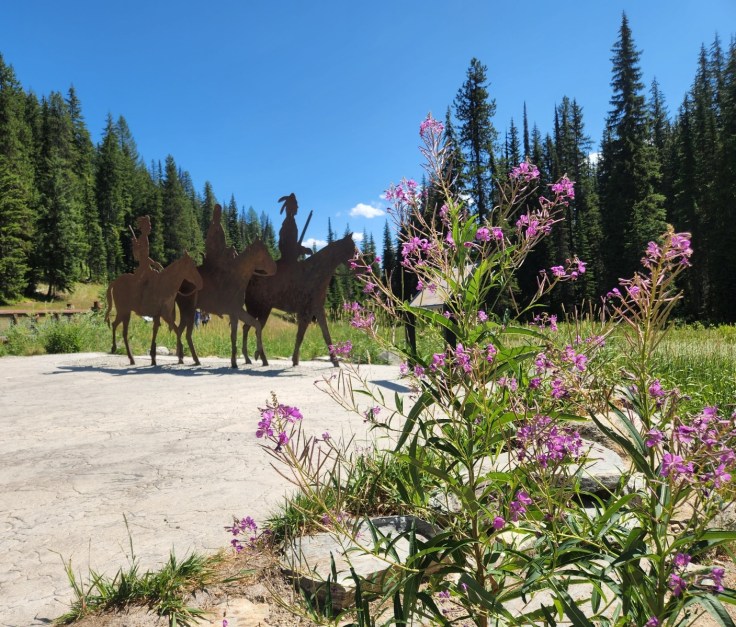 According to the placard behind the visitor’s center: “From Jun-Oct 1877, more than 750 Nez Perce (Niimiipuu) men, women and children, and 2000 horses eluded the pursuing U.S. Army across much of the Pacific Northwest and part of the Great Plans, through Oregon, Idaho, Montana, and Wyoming.” As they made their “heroic, yet futile flight seeking freedom and peace” from settlers and gold-seekers, their 1170 mile journey ended when 200 managed to escape to Canada, while the rest were captured and taken to Fort Leavenworth, Kansas. Though, years later, the captured were allowed to return to the Pacific Northwest, their homeland was no longer theirs. “Today, many descendants live on the Nez Perce, Colville, and Umatilla Reservations.”