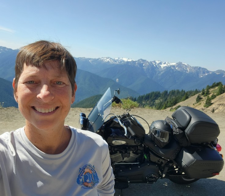 I rode the 17-mile Hurricane Ridge Road up to the Visitors Center overlooking the Olympic Mountain Range. Here’s how my Butler Motorcycle Map describes this ride: “Just inside the northern edge of the Olympic National Park is the crown jewel of the peninsula, a tour with everything a rider desires: tunnels, tight curves, rapid elevation changes, breathtaking scenery and drop offs with no guardrails- it’s exciting riding, both climbing and descending.” 🙂