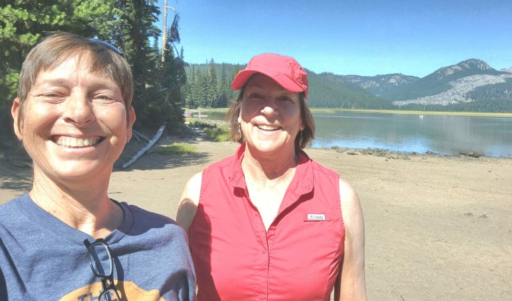 After my killer brunch, I found my way to Ann’s place. It didn’t take us long to pick up right where we left off, even though we hadn’t actually seen each other since 2008! I met her husband Larry, and immediately felt at ease and at home. She set a leisurely pace for my visit and was the consummate tour guide. An avid hiker, she went easy on me for sightseeing and took into account that my hips and feet can’t take much hiking these days. I use the term “hike” very loosely on this blog…it usually means a short stroll in the woods 😉 Our driving tour started off on the Cascade Lakes Scenic Byway, where we made a stop at Sparks Lake to get out and stretch our legs.