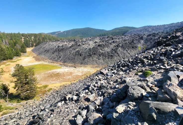 From Sparks Lake, we headed east towards the Deschutes National Forest and Newberry National Volcanic Monument. As Ann navigated her car up the 4-mile, twisty, washboarded National Forest dirt road to Paulina Peak Observation Site, at an elevation of 7,984 feet, I was thankful to not be on my motorcycle! We enjoyed the scenic view of Paulina Lake while we ate a picnic lunch, then walked to the other side of the lookout to get a bird’s eye view of the Big Obsidian Flow, the youngest lava flow in Oregon (1,300 years old). –FS & USDA website