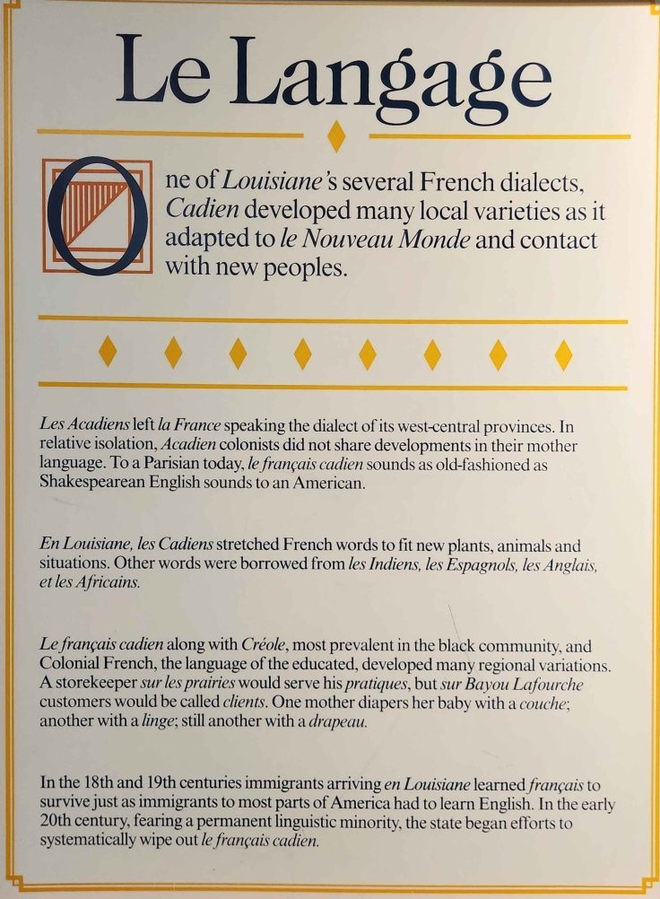 A museum placard describing French used by Cajuns. Of note, a unanimous vote recently by the Louisiana Legislature passed a bill to establish the first Cajun French immersion school, called École Pointe-au-Chien. The school will be south of Montegut, in a district which services primarily members of the Pointe-au-Chien Indian tribe. One of the criteria for a Native American tribe to gain Federal recognition is to have cultural patterns, including language, that is different from those of the non-Indian populations with whom they interact. It’s a bit ironic that this tribe, who has not been able to gain Federal tribal recognition, will be the group making one of the biggest contributions to save the Cajun French language. Because they had to replace their own native tongue with Cajun French hundreds of years ago in order to survive, a part of their cultural pattern that makes them different from the Cajuns around them, has been lost to time.