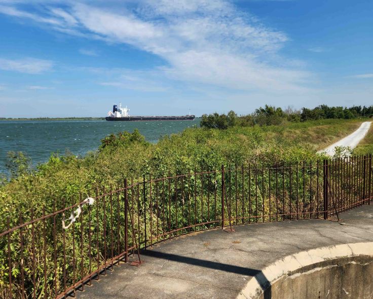 At the Fort Jackson overlook, there is a fascinating historical marker with the story of Eads’ Jetties. In the late 1800s, the Army Corps of Engineers’ efforts to dredge the ever-forming sandbars that were blocking shipping into the Port of New Orleans were failing miserably. An intrepid shipbuilder from St. Louis, named James Buchanan Eads, won a contract to construct wing dikes, perpendicular to current flow at South Pass (18-miles south of Fort Jackson where the Mississippi River branches into the Gulf of Mexico), which created a self-scouring channel. This spurred a bitter rivalry between Eads and the Army Corps of Engineers. Upon completion in 1879, his jetties created a 30-foot channel which contributed to the Port of New Orleans advancing from the 9th, to the 2nd, largest port in the United States. Almost 100 years after besting the Army Corps of Engineers, his jetties were designated as a historical landmark. –PBS website and historical markers