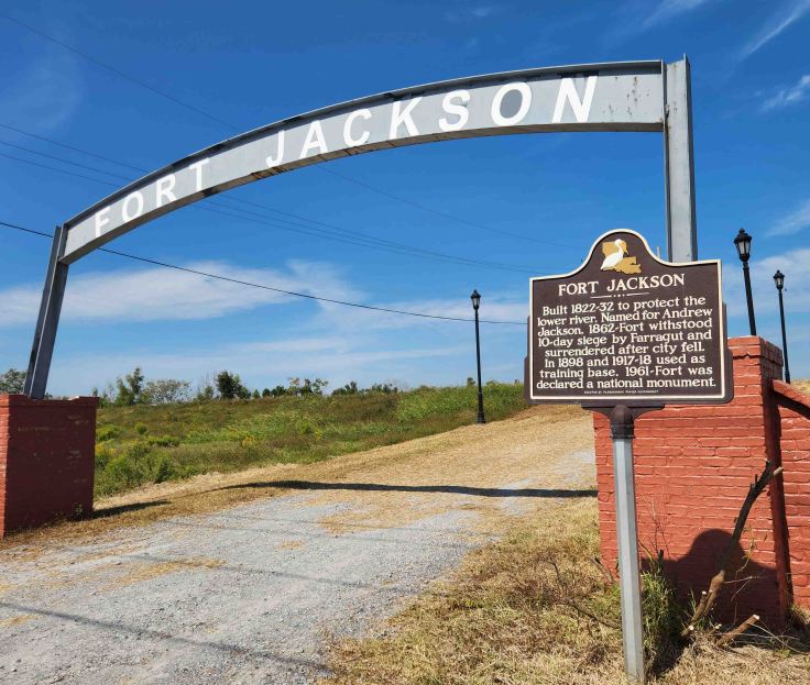 There is a great view of the Mississippi River from an overlook at Fort Jackson. “Fort St. Philip is located directly across the Mississippi River from Fort Jackson. The forts are located on a bend in the river, which required a slow and difficult maneuver for naval ships trying to sail upstream and avoid cannon fire. In the War of 1812’s Battle of New Orleans, Fort St. Philip successfully halted the advance of the British Navy on the Mississippi River.” -Heart of Louisiana website