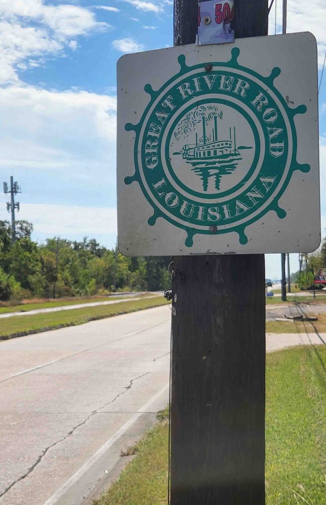 I picked up LA-23, a section of the Great River Road in Louisiana, just after NAS JR Base Belle Chase. It is part of a 3,000-mile National Scenic Byway that traverses ten states. “It is a well-marked series of different roads and highways that roughly follow the winding course of the Mississippi River. All along the Great River Road, travelers will find white signs displaying the green pilot’s wheel logo. The familiar pilot’s wheel symbol (iconic representation of Riverboat travel) denotes which roads are part of the designated route…which has been selected for its natural, cultural, historical, recreational, and scenic properties.” -Great River Road website