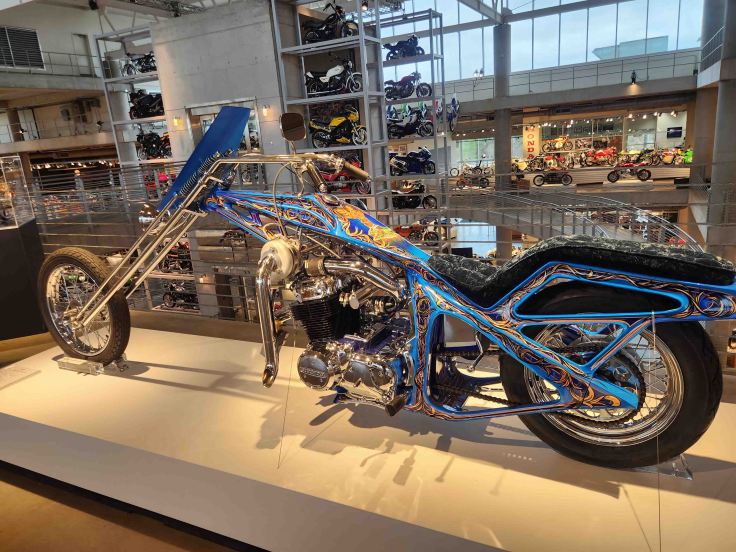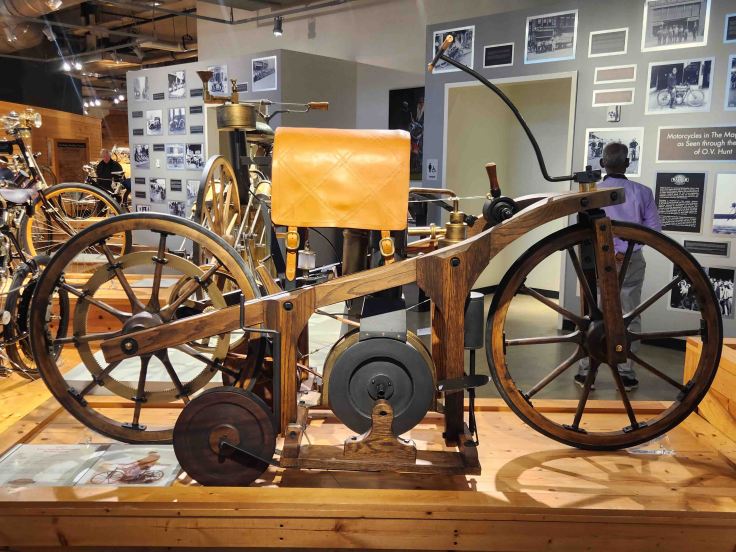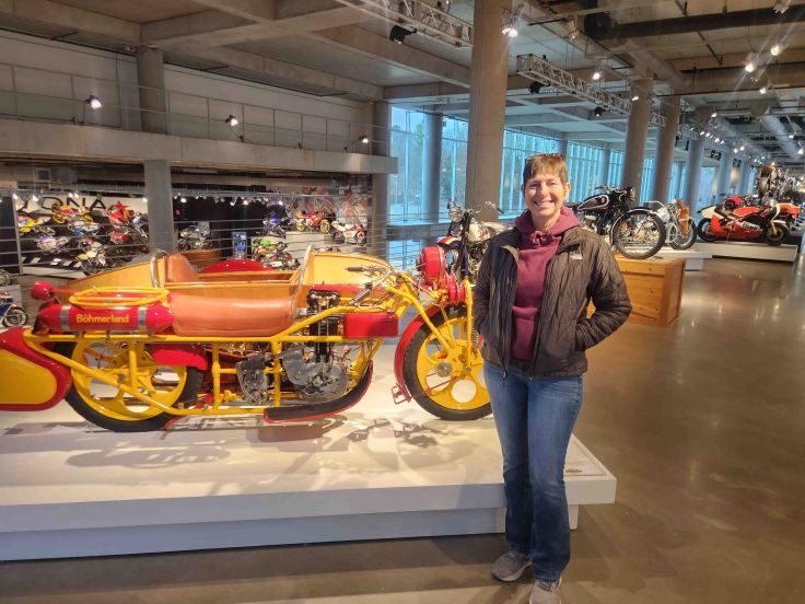 The 250,000 square feet museum is located on an immaculately landscaped 880-acre park that includes a road course with ample space for spectators, larger than life metal sculptures, and unexpected, humorous discoveries planted throughout the building and grounds. Although the museum is mostly motorcycles – 1,600 of them spanning 100 years of production – it also includes an impressive collection of vintage racecars, rare vehicles, and even outboard motors! George Barber raced Porches in the 1960s, then started collecting and restoring classic cars in 1988. According to the museum’s website: “Since the world’s best and largest car collections had already been established, Barber heeded some wise advice…from his longtime friend Dave Hooper – a motorcycle enthusiast … – who suggested that Barber shift his focus from cars to motorcycles. Being a man of big dreams, Barber seized the opportunity to accomplish what no one else had done – build the world’s ‘best and largest’ motorcycle collection.” With hundreds of motorcycles representing 220 different manufacturers from 22 countries, this place is recognized by the Guinness World Records as the world’s largest motorcycle collection. Mission accomplished!
