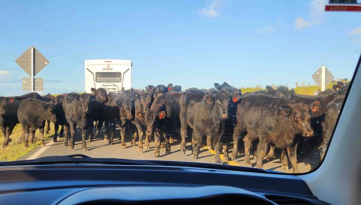 On the way south from Reinga Point, I was just starting to get comfortable driving on the left side of the road when I looked past the next curve and spied what appeared to be livestock jumping down an embankment and onto the road. Sure enough, we had to stop while quad-mounted (four-wheel all-terrain vehicle) cattlemen drove the herd up the road. I’m not sure if the cattle-drive was intentional or not, but the cattle were bigger than the rented “Blue Bullet” and made us a bit nervous!