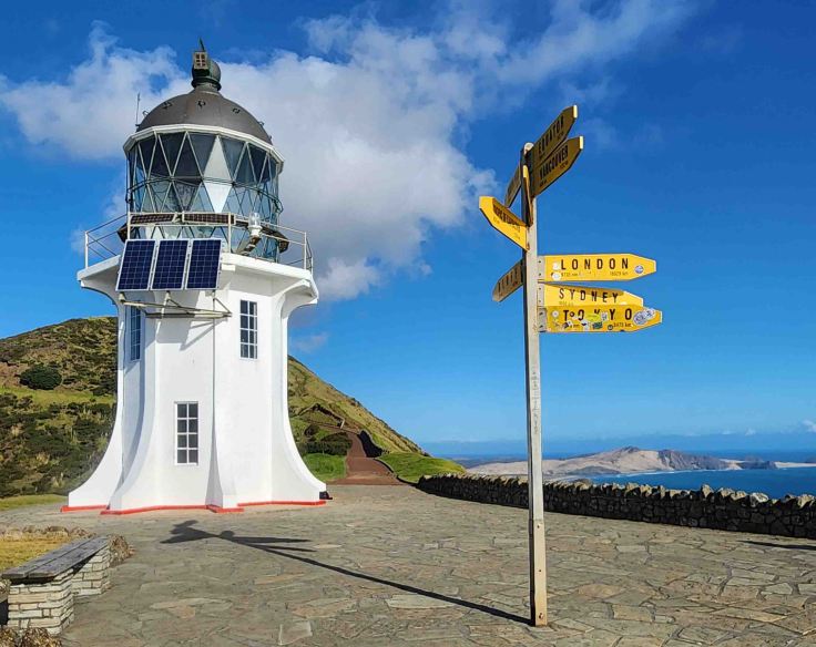 Though a bit steep in some places, the path leading to the Cape Reinga Lighthouse is well-maintained and includes several educational placards along the route. The mass of water behind the street signs is the Tasman Sea.
