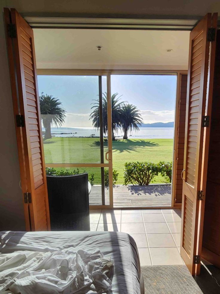 After our twisty, scenic, and livestock-packed road tour of the 62-mile long northern Aupōuri Peninsula, we overnighted at the Copthorne Hotel, within the Waitangi National Trust Reserve. We awoke to this view of Bay of Islands right from our room 😊