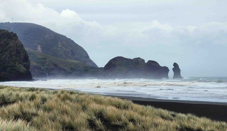 A stroll along the black-sand beach of Piha on a rainy, windy day really highlighted the qualities that make Piha New Zealand’s most famous surf beach. With many roads closed due to “slips” (landslides) from recent heavy rains, this hilly, western town on the Tasman Sea had a rugged, remote feel to its beauty. The rock formation in this pic is Lion Rock.