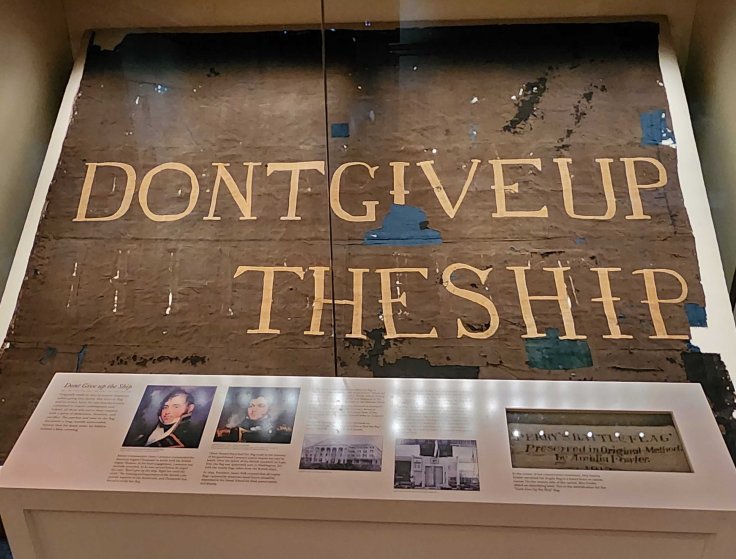 Located in the Academy Museum, this historic flag was made in 1813 in memory of Master Commandant James Lawrence, Commander of the American frigate Chesapeake during the war of 1812. According to the placard accompanying this original flag “In the brief engagement, Lawrence was mortally wounded. As he was carried below, he urged his crew ‘Don’t give up the ship, fight her until she sinks.’ Although a great rallying cry, the crew ultimately did strike her flag (i.e., surrender).A replica of this flag hangs in Memorial Hall, where Matt retired.