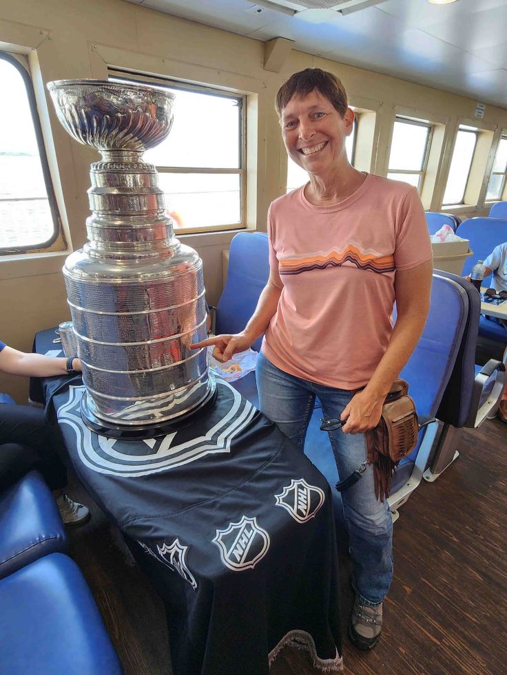 Before I knew it, my day in New Jersey had come to an end and I again loaded my bike onto the ferry, but this time without starter mishaps! Once my bike was safely stowed on deck, I went up to the indoor dining section to get a bite to eat. As I sat down with my snack, I looked up to see what I could’ve sworn was the National Hockey League Stanley Cup sitting atop a table a few yards from me. Sure enough, the Cup was travelling to the hometown of one of the staff of the Vegas Golden Knights, who was having her turn to take the Cup on a tour, accompanied by several other staff. According to HockeyAnswered.com, “each championship team is allowed to put up to 52 names on the cup that includes players, coaches, management, and staff.” The folks travelling with the Cup, helped me find my friend Paul’s name, who was the head Strength and Conditioning Coach, and Dietitian, for the 2001 championship team (I’m pointing to it in the pic)!