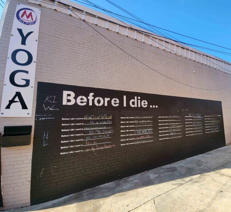 “Before I Die is a global art project that invites people to reflect on death and share their personal aspirations in public. Originally created by Candy Chang in New Orleans after the death of a loved one, there are now over 5,000 walls around the world.” (BID website) The owners of M Power Yoga Studio, Haley Filer and Cecil Zeringue, along with their friend Alyssia Hay, turned the studio’s bare exterior wall into Houma’s contribution to the project (click HERE for article). I had enjoyed going to their hot yoga classes on my last visit, so my sister took me to the wall to make my contribution. Before I die I want to: see full women’s equality!