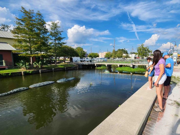 Bayou Terrebonne runs right through downtown Houma, which has become the unifying focus of several public areas, businesses, aquatic art, and cultural centers. In this photo, three generations (Monica, Andy, and Jenney) gather to feed the fish and turtles behind the Bayou Terrebonne Waterlife Museum.