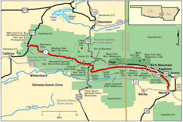 Talimena Scenic Drive is a 54-mile National Scenic Byway that passes over Winding Stair and Rich Mountains and through Ouachita National Forest. Talimena is a combination of the byway’s terminus town names – Talihina, Oklahoma on the west, and Mena, Arkansas on the east.