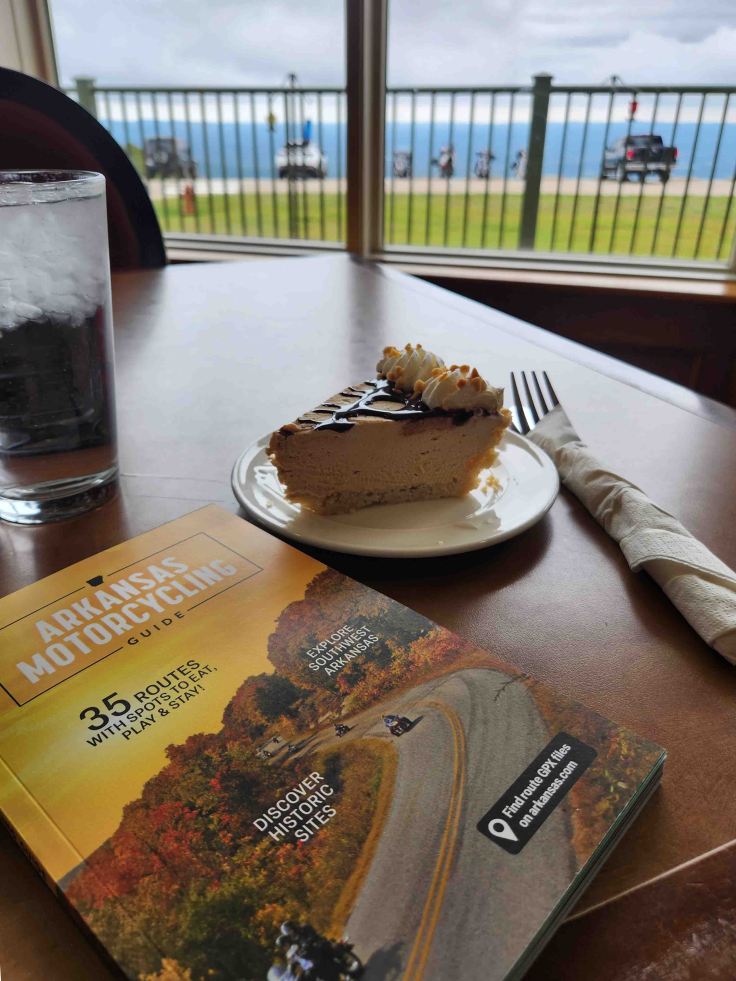 The Arkansas Motorcycling Guide is a great source of riding information. Staci Wilt, creator of Ride to Food and one of the few travel bloggers that I follow, contributed several dining recommendations to the Arkansas guide. Her endorsement for pie at the Queen Wilhelmina State Park Lodge was spot on! The peanut butter version, and the view from my table, were amazing!