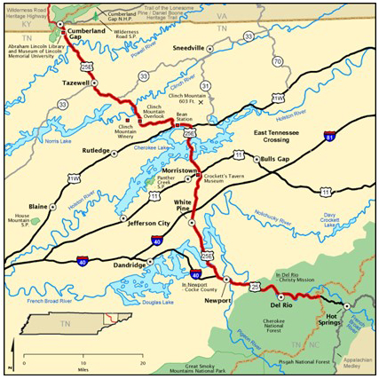 The 83-mile East Tennessee Crossing National Byway follows an ancient game trail that was used by both the Shawnee (in the north) and the Cherokee (in the south) known as “Warriors Path” and later dubbed “Wilderness Road” as it transitioned to a pathway led by Daniel Boone for approximately 300,000 frontier settlers. It further transitioned into a section of the “Dixie Highway,” an early 1900s effort to connect the Midwest to the south, and then became part of the legendary “Thunder Road” moonshine route during Prohibition. So much history on this route!