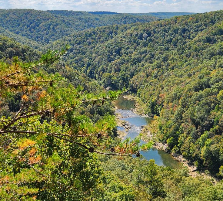 First stop was a ride and short hike to Lilly Bluff Overlook on the Obed National Wild and Scenic River. Added to the National Park System (NPS) in 1976, lands within the Obed Wild and Scenic River are jointly managed by the NPS and the Tennessee Wildlife Resources Agency. As you can see in the pic of the approach to the overlook, the surrounding forest, made up of oak, hickory, poplar, pine, and hemlock, were just starting to transition to fall colors.