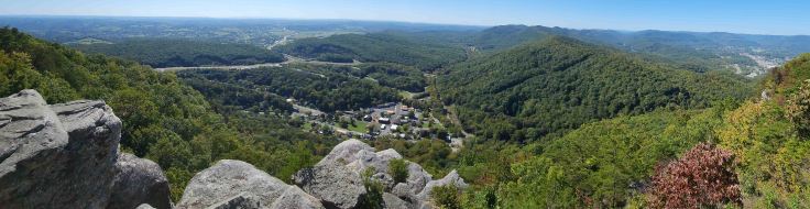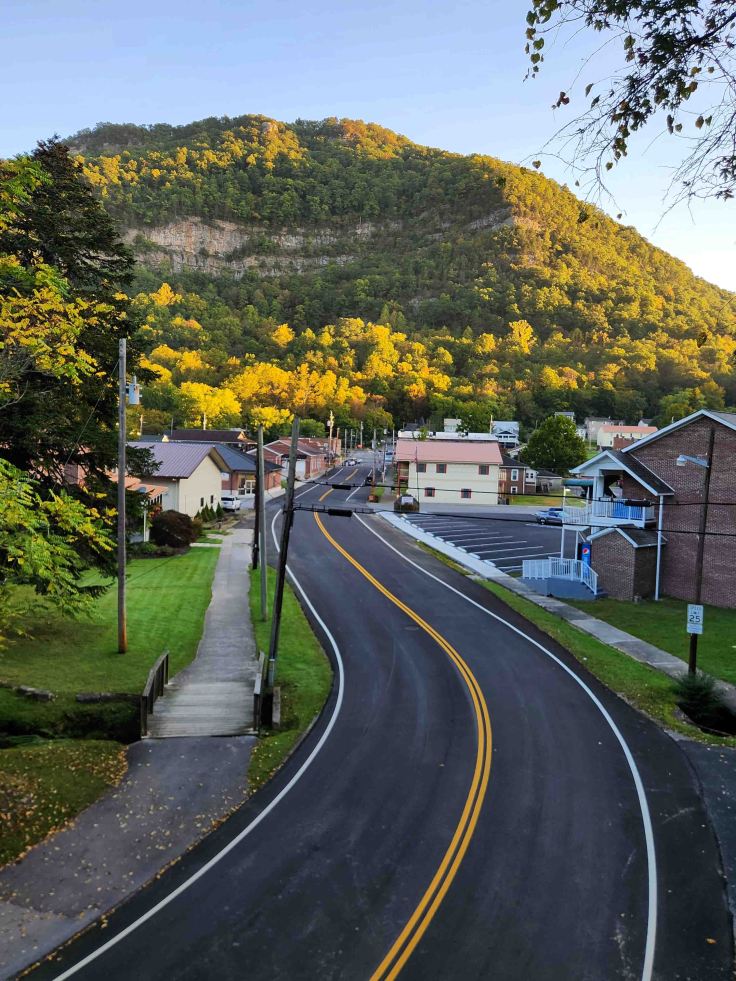 View of the town of Cumberland Gap from Pinnacle Overlook. If you zoom in, the building on the edge of town at a 45-degree angle and triangular parking lot is the Cumberland Gap Inn. The 4-mile twisty road from the visitor center to the overlook parking lot was a fun ride!