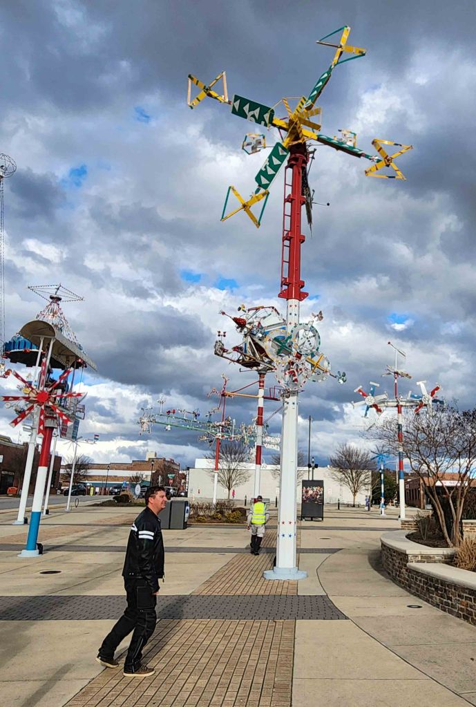 First up was a ride to theVollis Simpson Whirligig Park and Museum in Wilson, NC. WWII Army Air Corps veteran, Vollis Simpson, worked as a rigger and farm machine repairman post-military service. According to the museum named after him, once he retired in 1985, he spent his time creating giant, wind-driven sculptures and installing them around the pond on his farm. Over time, his whimsical creations became known as “whirligigs” and developed quite a following.